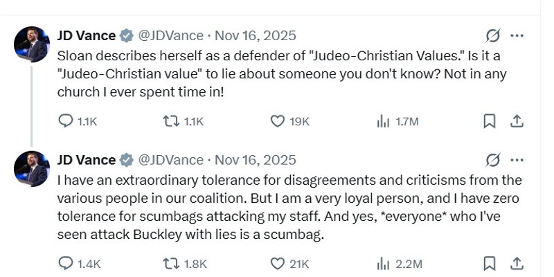 In the comments section of same X post VP Vance stated "Sloan describes herself as a defender of "Judeo-Christian Values." Is it a "Judeo-Christian value" to lie about someone you don't know? Not in any church I ever spent time in!" and "I have an extraordinary tolerance for disagreements and criticisms from the various people in our coalition. But I am a very loyal person, and I have zero tolerance for scumbags attacking my staff. And yes, *everyone* who I've seen attack Buckley with lies is a scumbag."